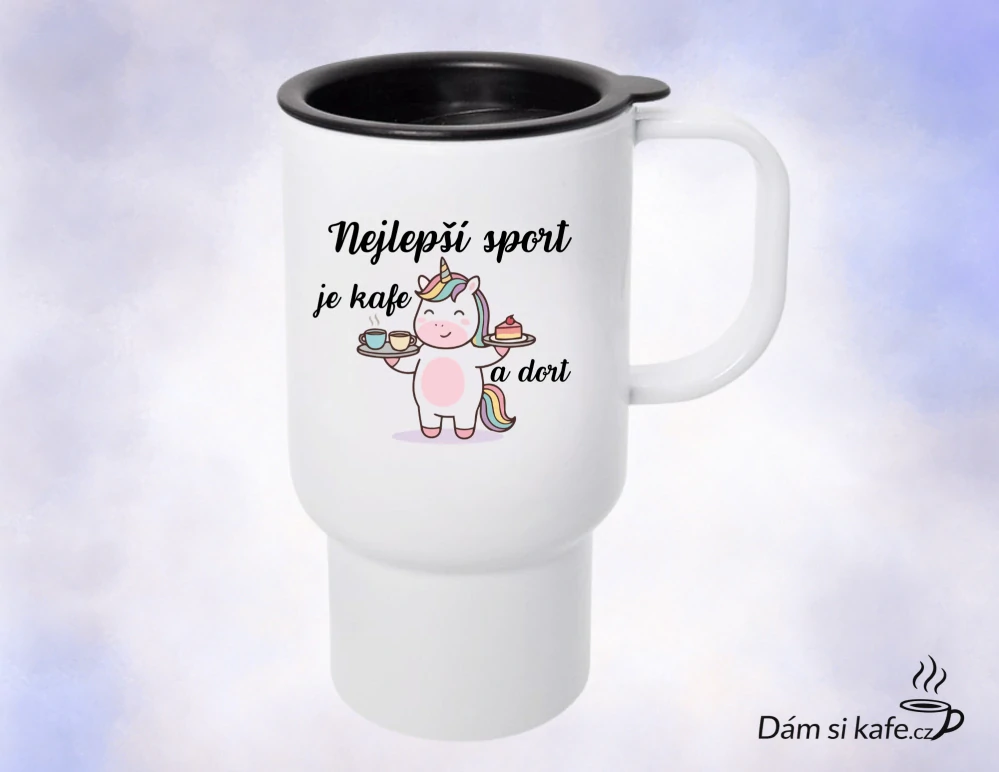 Cestovní polymerový hrnek „Nejlepší sport je kafe a dort“ – Jednorožec edice (300 ml)