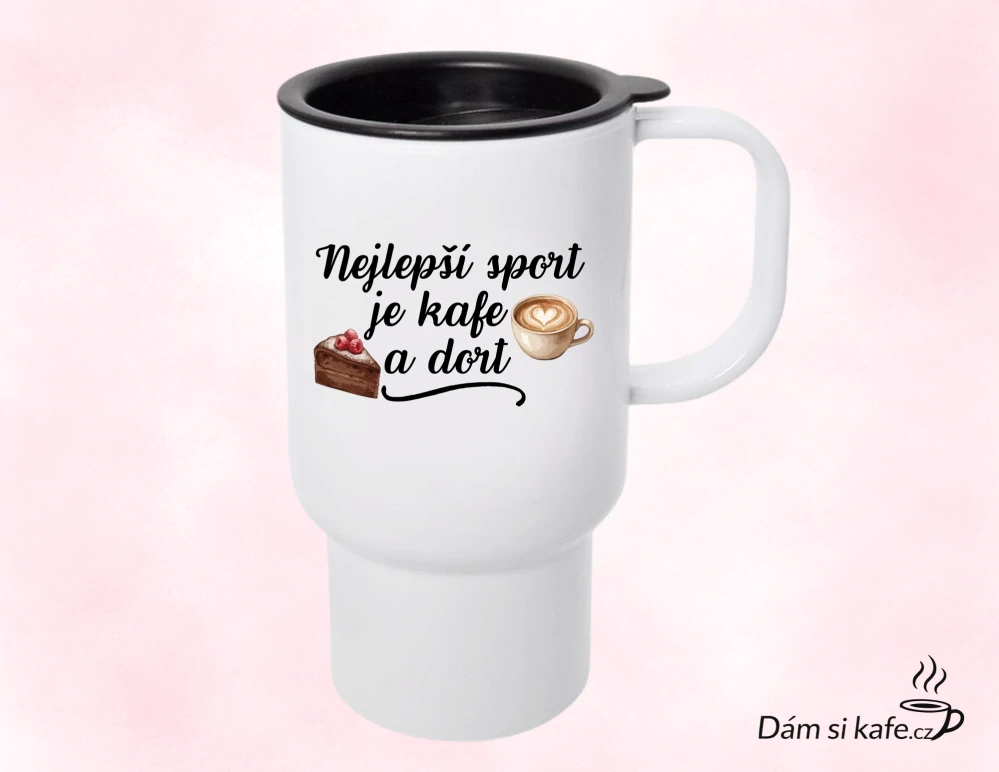 Cestovní polymerový hrnek „Nejlepší sport je kafe a dort“ – 300 ml