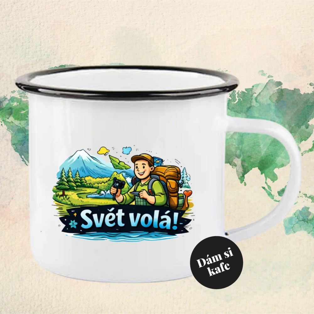 Plecháček s textem „SVĚT VOLÁ“. Ideální dárek pro cestovatele a milovníky dobrodružství. celý popis